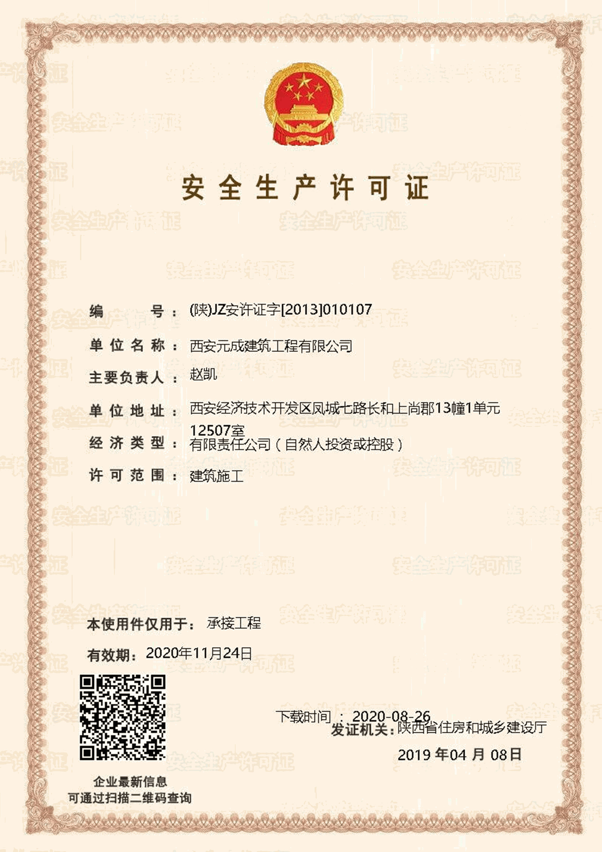 西安元成建筑工程有限公司成立于2012年,是一家擁有建筑工程、市政公用工程、石油化工工程、機電工程施工總承包貳級;鋼結構工程、防水防腐保溫工程專業承包貳級;電力工程、水利水電工程施工總承包叁級;建筑機電安裝工程、輸變電工程、環保工程專業承包三級;模板腳手架專業承包、勞務分包等綜合性施工企業。